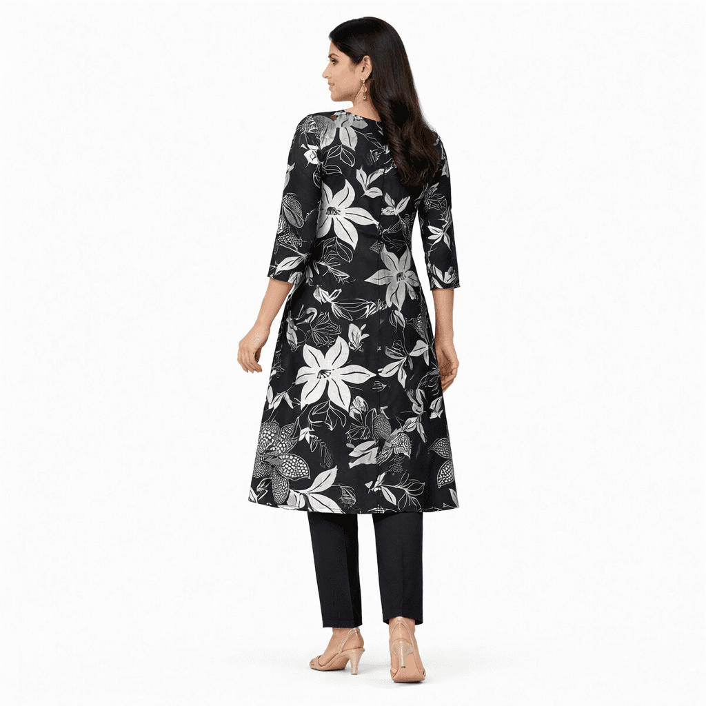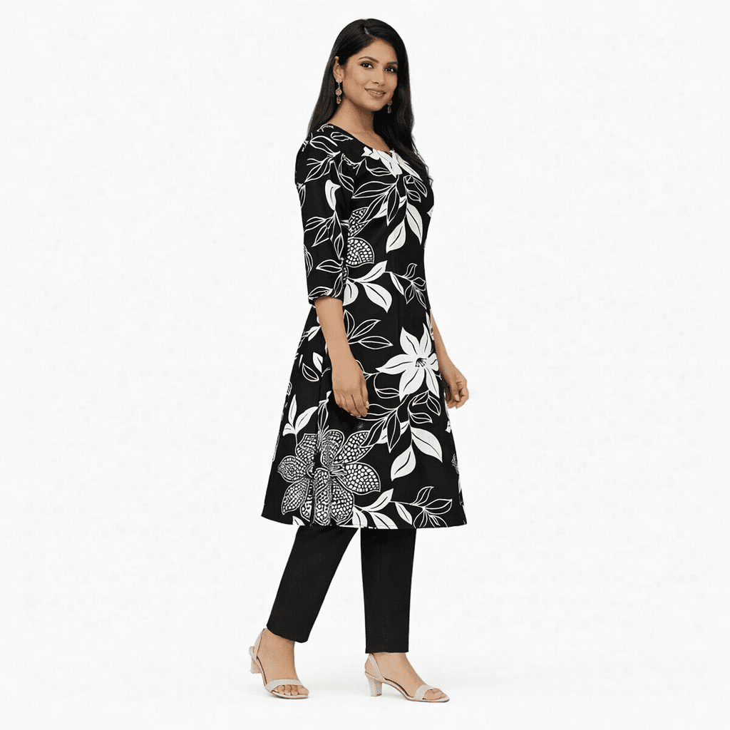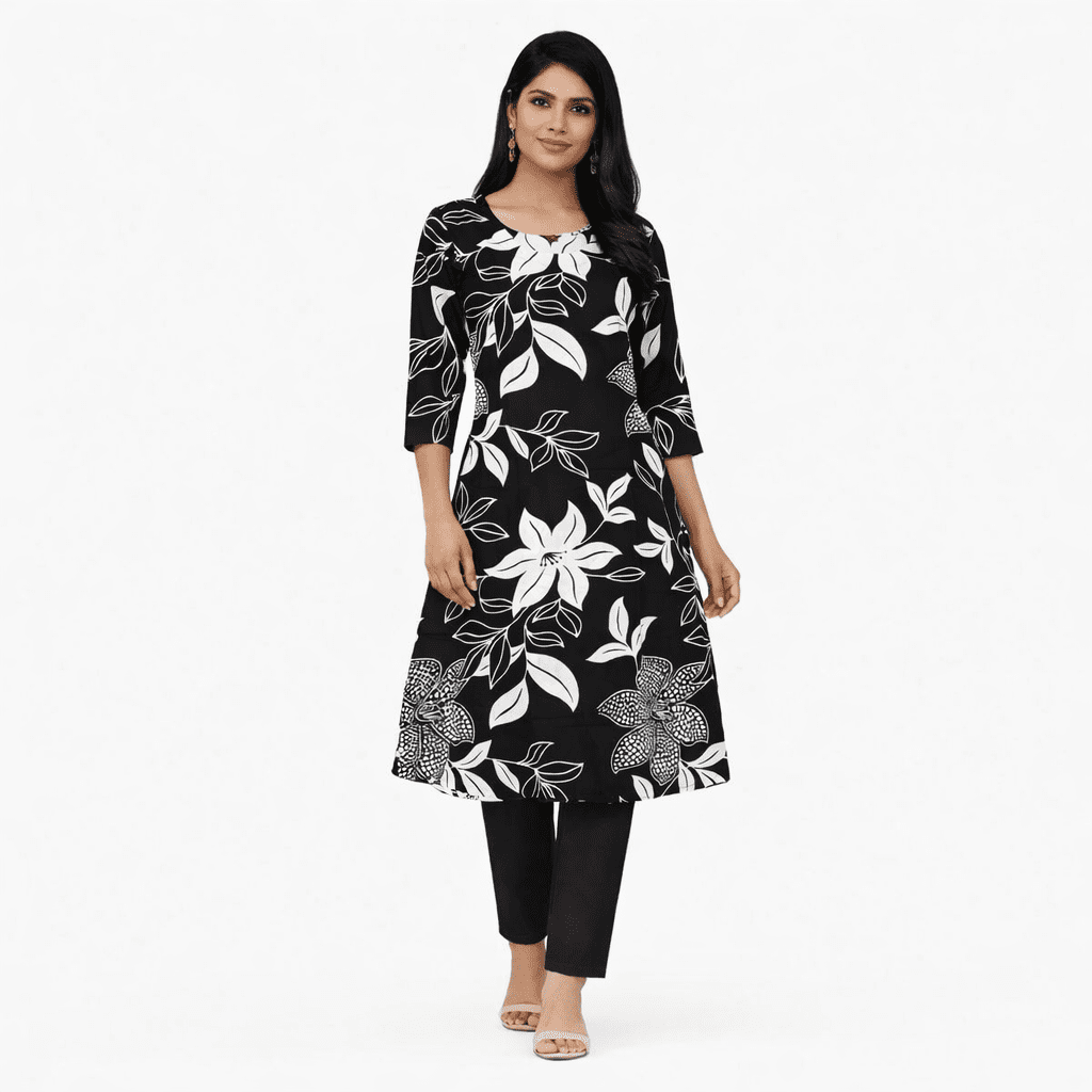 Designed with a flattering A-Line fit, round neck, and 3/4 sleeves, this knee-length kurti provides a graceful silhouette suitable for different body types. The matching black pants complement the kurti beautifully, creating a coordinated and stylish outfit perfect for casual outings, daily wear, office wear, or festive occasions.